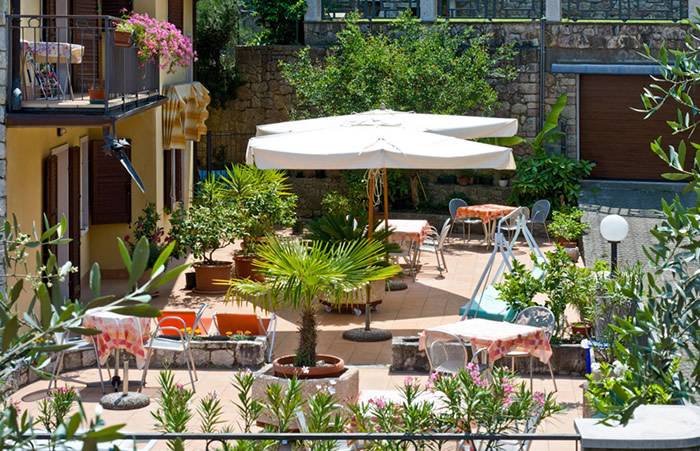 L'Hotel Pace si trova a Marniga, una frazione di Brenzone posta ai piedi del Monte Baldo, a pochi passi dal Lago di Garda (100 m). E' gestito con passione dalla famiglia Brighenti fin dagli anni '20. Nell'edificio principale si trovano il ristorante, il bar, la sala lettura, la sala TV e, sui due piani superiori, le camere e una terrazza panoramica con una vista spettacolare sul Lago di Garda. La dependance, di nuova costruzione, dispone di camere doppie e singole, un appartamento e una grande terrazza con vista sul lago. La casa principale dispone di 4 camere differenti, tutte dotate di bagno privato, telefono e frigo su richiesta, citofono. Le tipologie sono le seguenti: camera doppia con vista lago di 16 mq (su richiesta letto supplementare); camera doppia con vista lago di 11 mq; camera doppia con vista sul cortile o sulla strada (13 mq); camera singola con vista sulla strada (10 mq). La dependance dispone di 5 tipologie di ... camere: camera doppia con terrazzo e vista lago (20 mq) con aria condizionata (a pagamento), su richiesta terzo letto; camera doppia con balcone e vista lago (14 mq); camera doppia senza balcone, che si affaccia sulla terrazza (20 mq), aria condizionata (a pagamento), terzo letto su richiesta; camera singola senza balcone e senza vista lago (10 mq). L'appartamento è dotato di camera da letto, cucina, bagno, telefono, aria condizionata (a pagamento). Il ristorante dell'Hotel Pace è aperto a pranzo e a cena e offre piatti tipici regionali accompagnati dall'olio d'oliva del Garda. A disposizione degli ospiti ci sono il nostro bar e la sala Tv con canali satellitari e Wi-Fi. Tra i servizi aggiuntivi: parcheggio gratuito, garage a pagamento, aria condizionata, sala lettura. Accettiamo animali di piccola taglia. La località di Brenzone è nota per le sue condizioni di vento ideali per i surfisti e kite surfers: troverete numerose scuole nelle vicinanze. La posizione è ideale per fare passeggiate e trekking sul Monte Baldo, dal quale potrete ammirare fantastici panorami sul Lago di Garda.